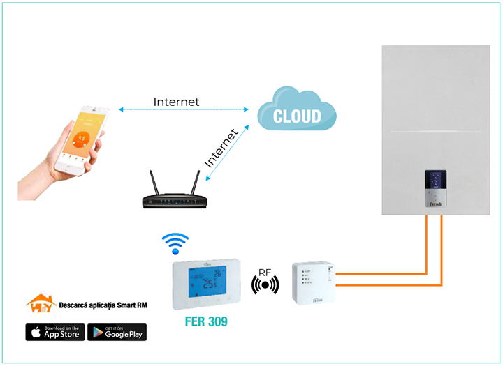 FER 309 este un termostat digital inteligent cu WI-FI, ce permite gestionarea temperaturii ambientale din spațiul de locuit de pe smartphone prin aplicația dedicată - Smart RM, prin control vocal (compatibil cu Amazon Alexa, Google Home) sau manual, direct de pe unitatea mobilă .