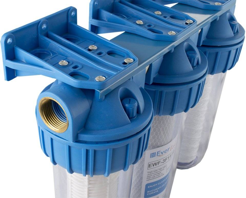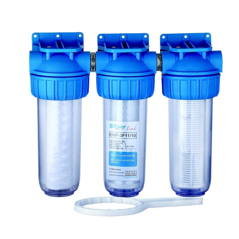 Filtru apă triplu cu cărbune/bumbac/sită asigură o filtrare completă a apei care intră în locuința dvs. Cele trei elemente filtrante dispuse în serie sunt poziționate pentru a îndepărta suspensii mecanice din apă cum ar fi nisip, nămol, rugină sau particule de materii, în 3 pași. (50 - 5 microni).