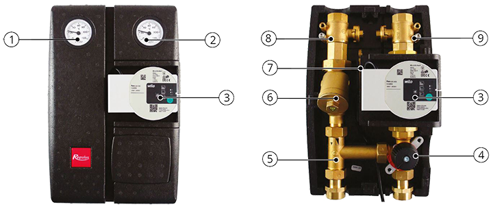 Stația de pompare cu două linii este proiectată pentru circuite de încălzire mixte. Acesta asigură fluxul prin sistemul de încălzire, amestecă până la temperatura de ieșire printr-o supapă de amestec controlată manual (poate fi utilizat orice actuator care va satisface nevoile sistemului și controlului specific). Stația