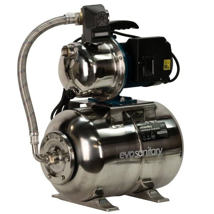 Hidroforul JET 110 EvoSanitary este recomandat pentru alimentarea cu apă de consum în regim automat din fântâni sau creșterea presiunii în instalațiile cu distribuție din rețeaua comunală, a locuințelor și grădinilor sau pentru alte aplicații. Pompa de 900 W are carcasa confecționată din inox. Vasul de expansiune cu care este echipat are membrana din cauciuc și o capacitate de 20 litri, fiind confectionat din oțel/inox.