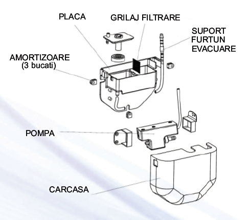 Pompa automată pentru condens este utilizată atunci când evacuarea directă a acestuia nu este posibilă. Pentru o utilizare corectă, produsul trebuie montat cu suportul de perete pe un plan vertical sub evacuarea condensului. De asemenea, pompa trebuie să fie cât mai aproape de evacuarea condensului, având grijă ca tubulatura să nu se stranguleze sau să nu se comprime. Pentru un traseu printr-un tavan fals, sunt necesare țevi și fitinguri adiționale.![]() Specificații tehnice: