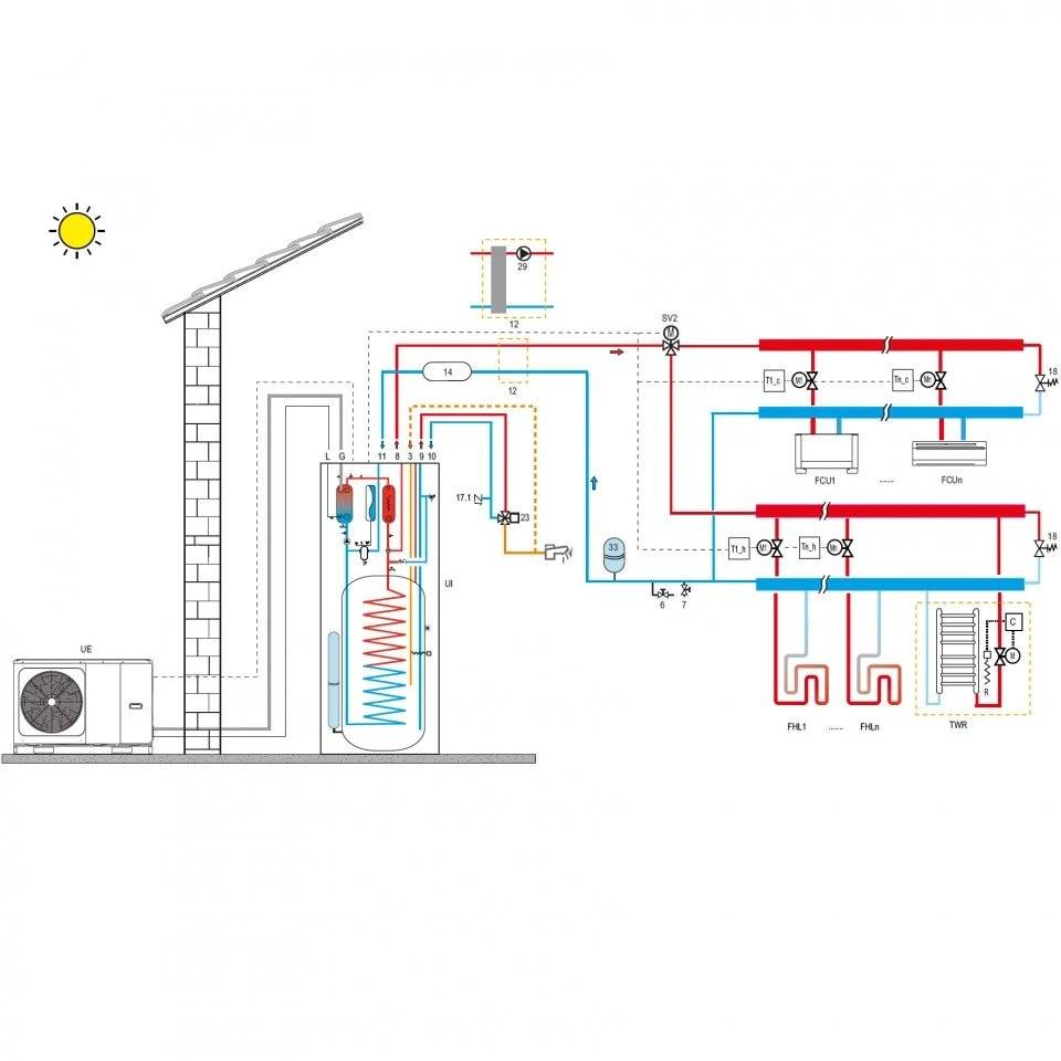 Cele două unități sunt racordate prin conducte frigorifice care nu sunt supuse riscului de îngheț și a căror lungime trebuie să fie calculată astfel încât să nu reducă eficiența pompei de căldură.